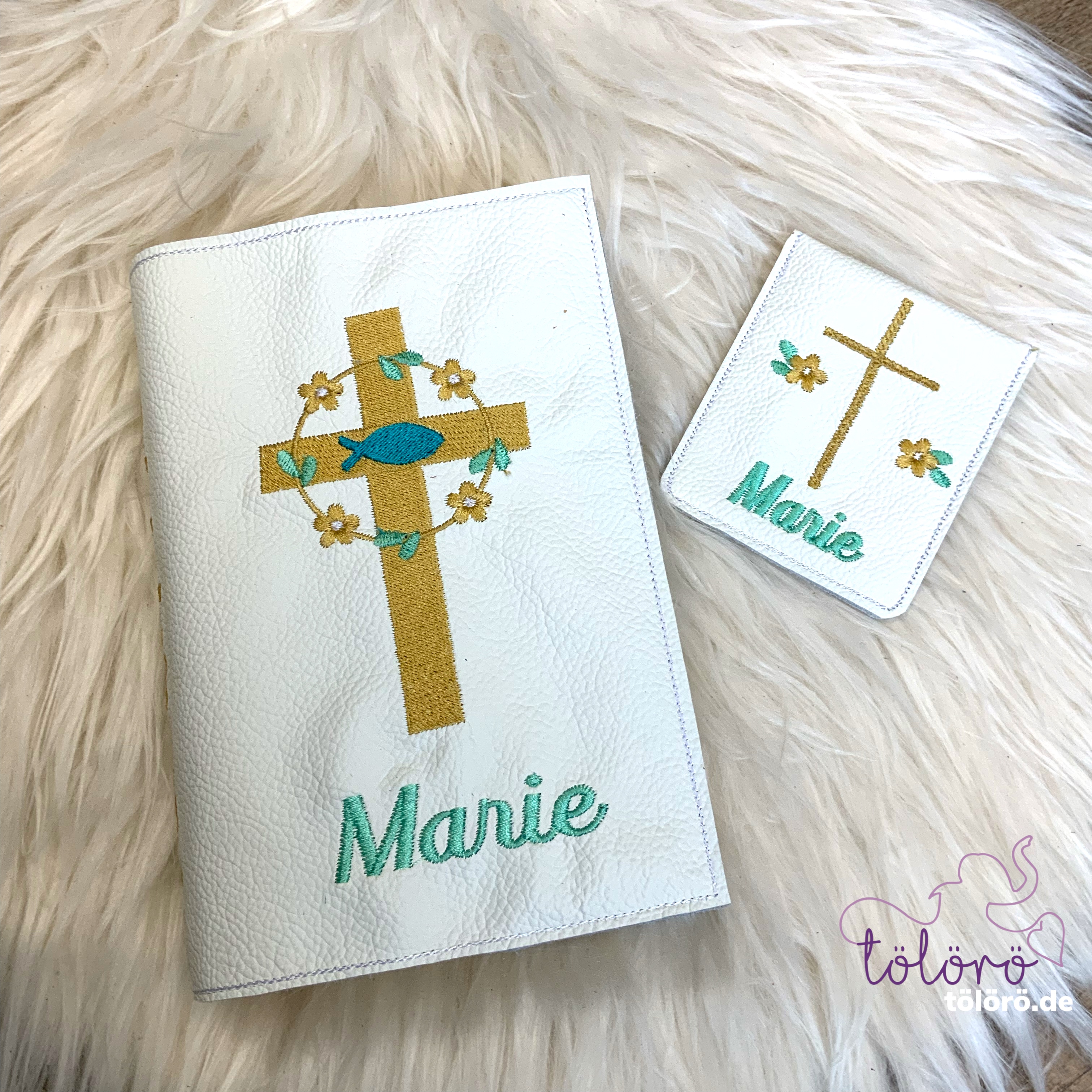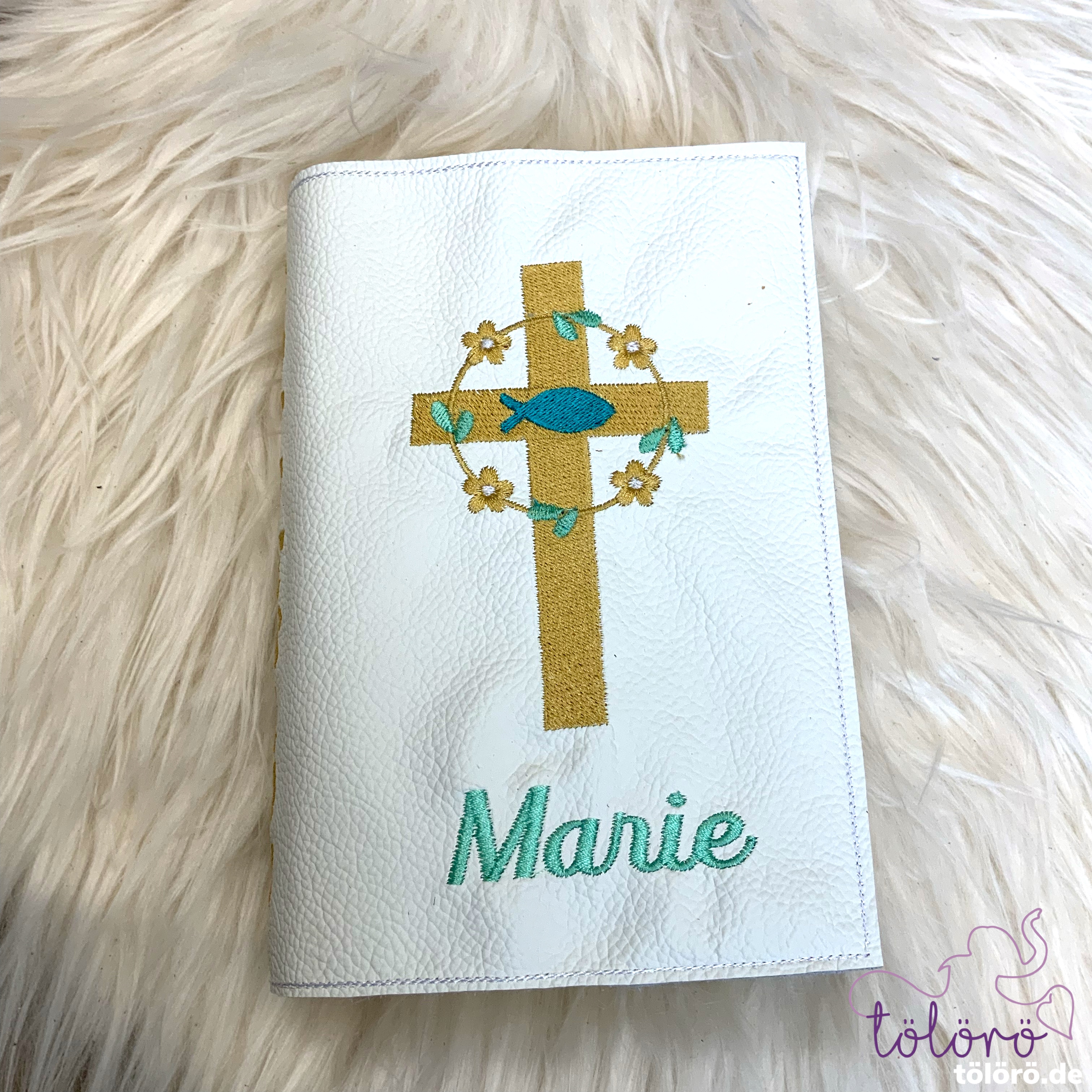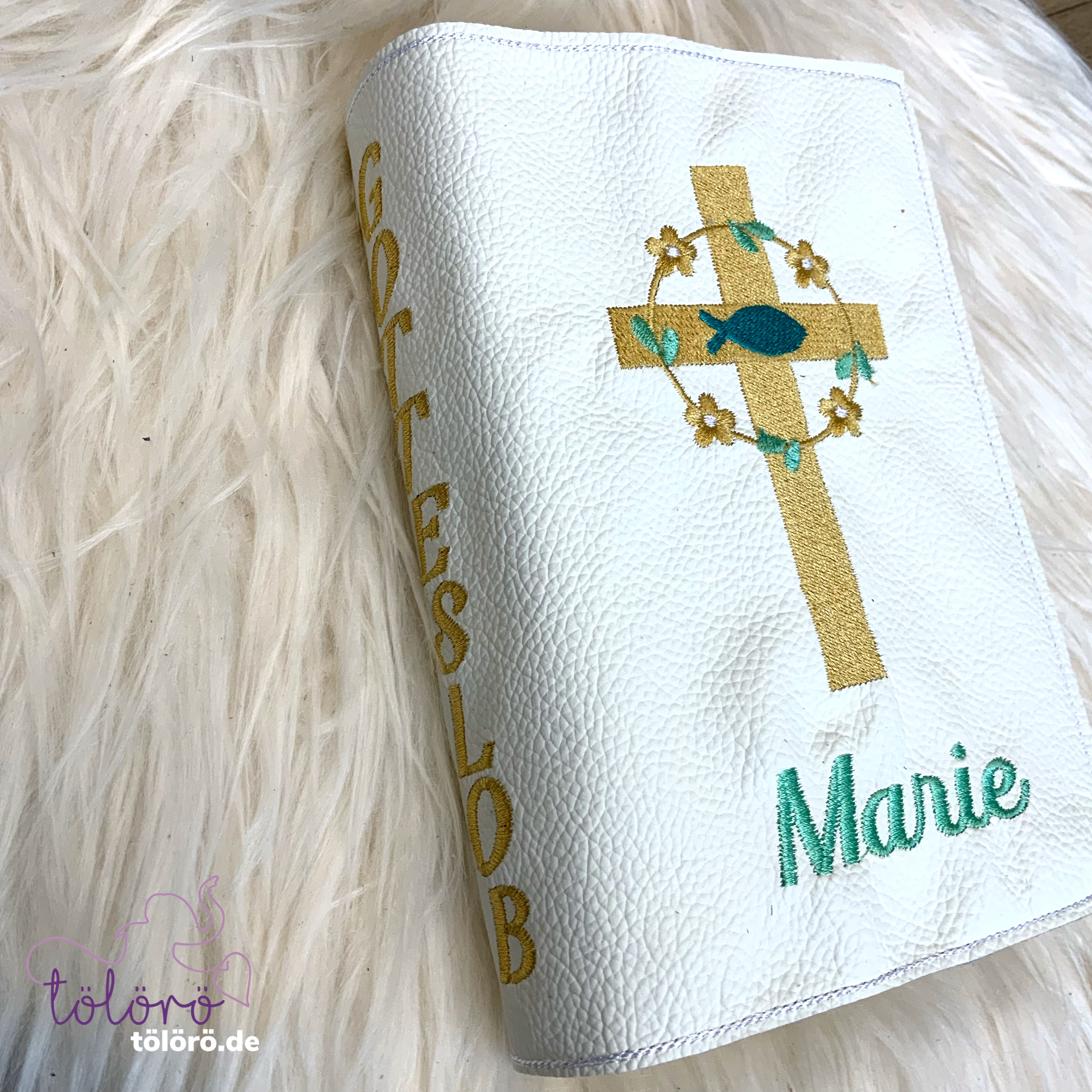 Gotteslobhülle breites Kreuz mit Blümchen und Fisch