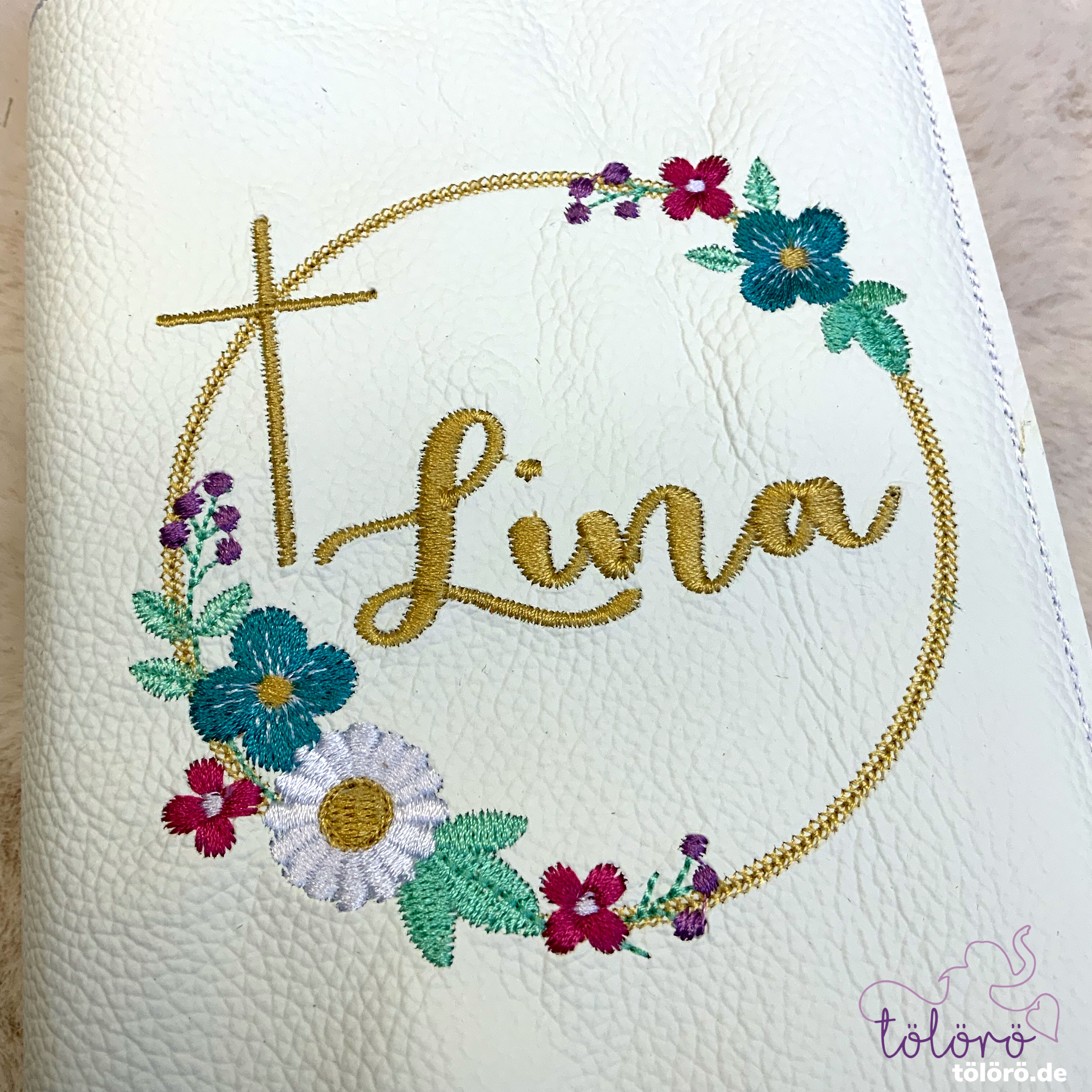 Gotteslobhülle Name im Blumenkreis mit Kreuz