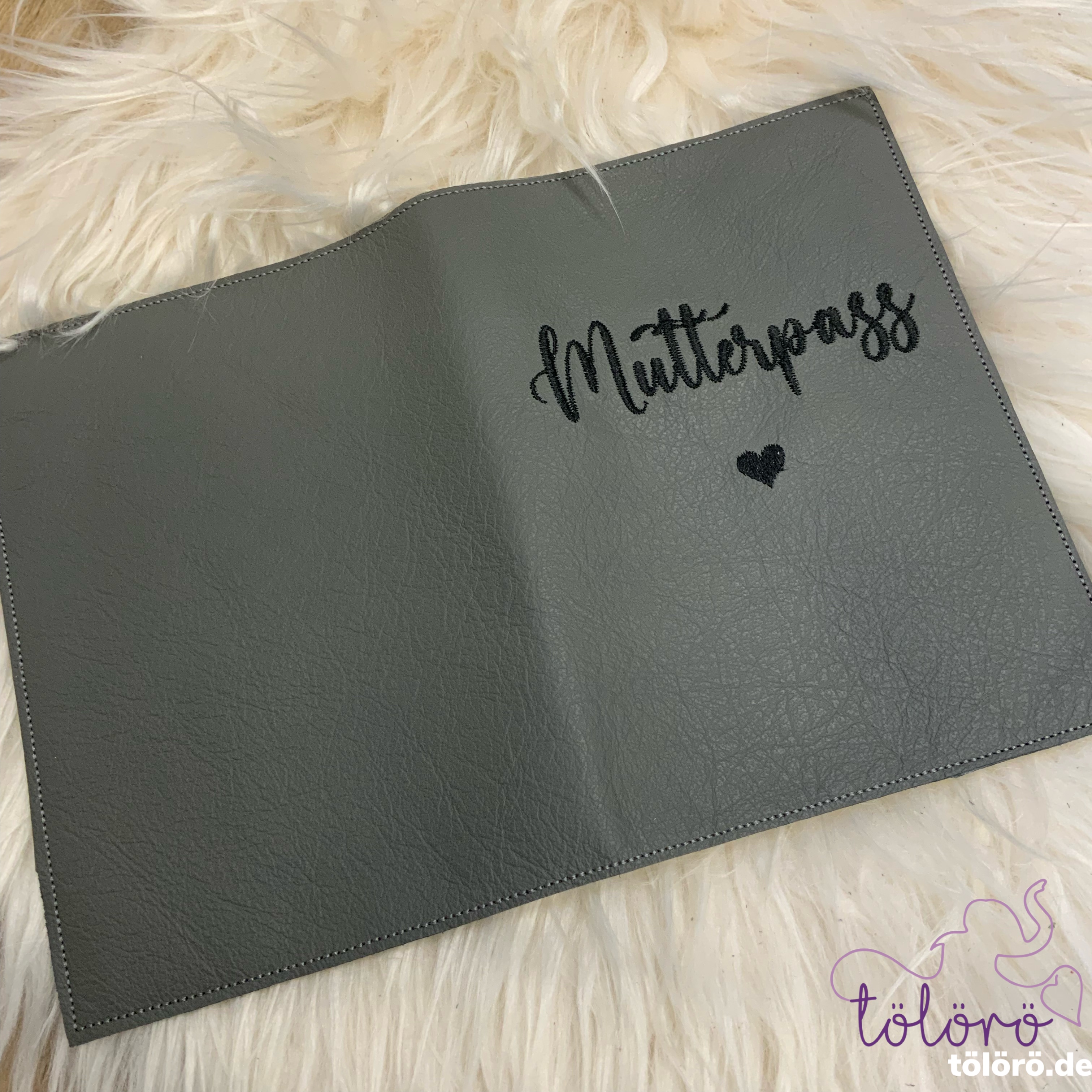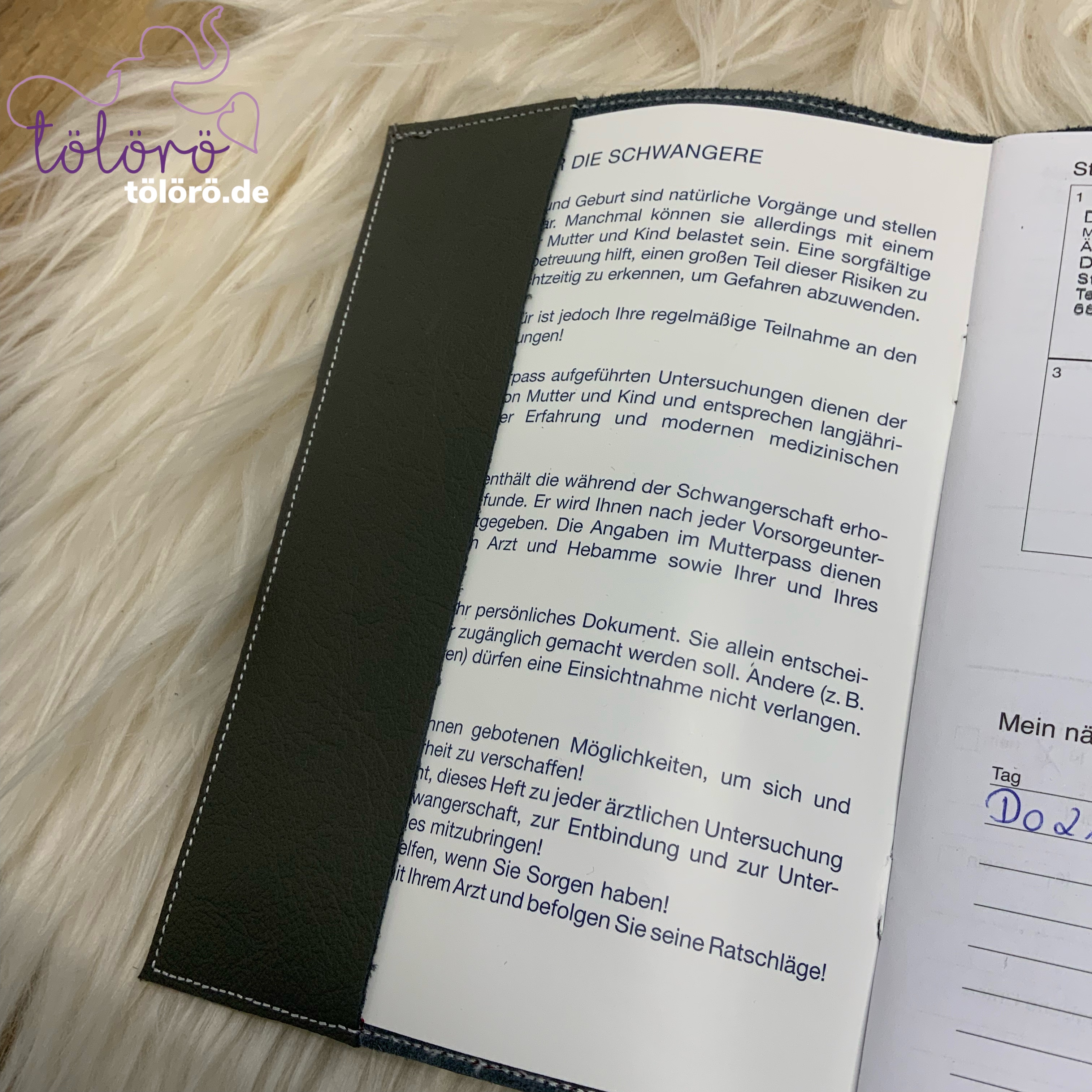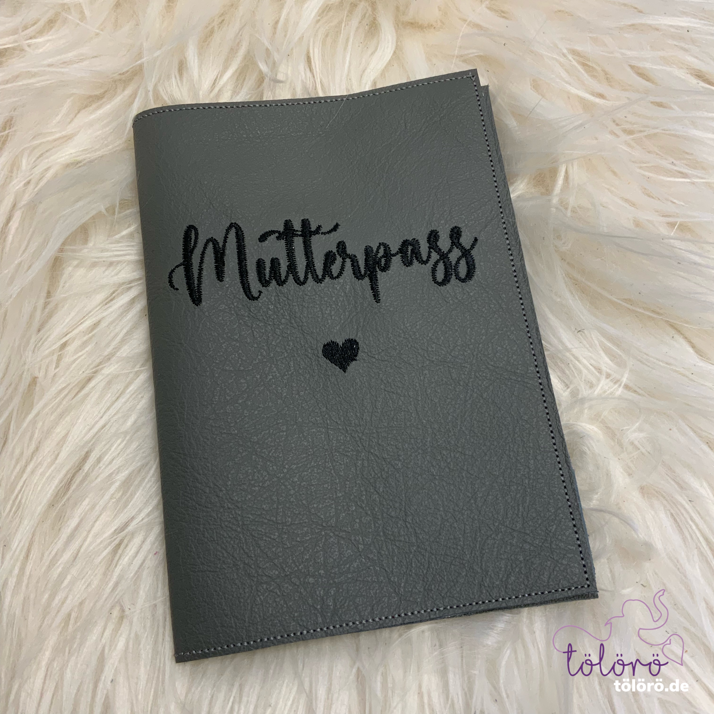 Die Hülle passt perfekt zum deutschen Mutterpass. Gib deine individuellen Wünsche bei der Bestellung an - Lederfarbe, Text und Farbe der Stickerei.