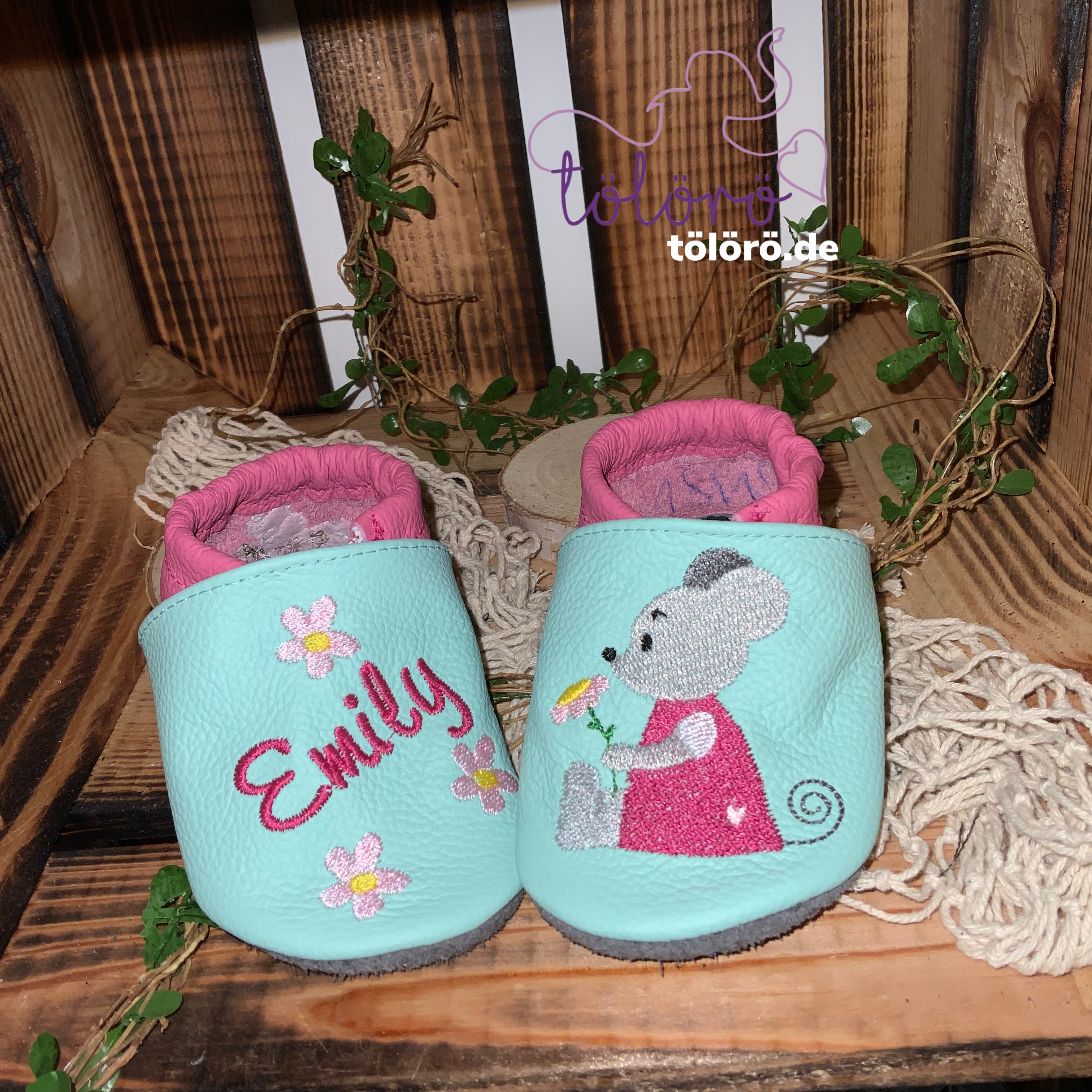Name mit Blumenstrauß und Maus