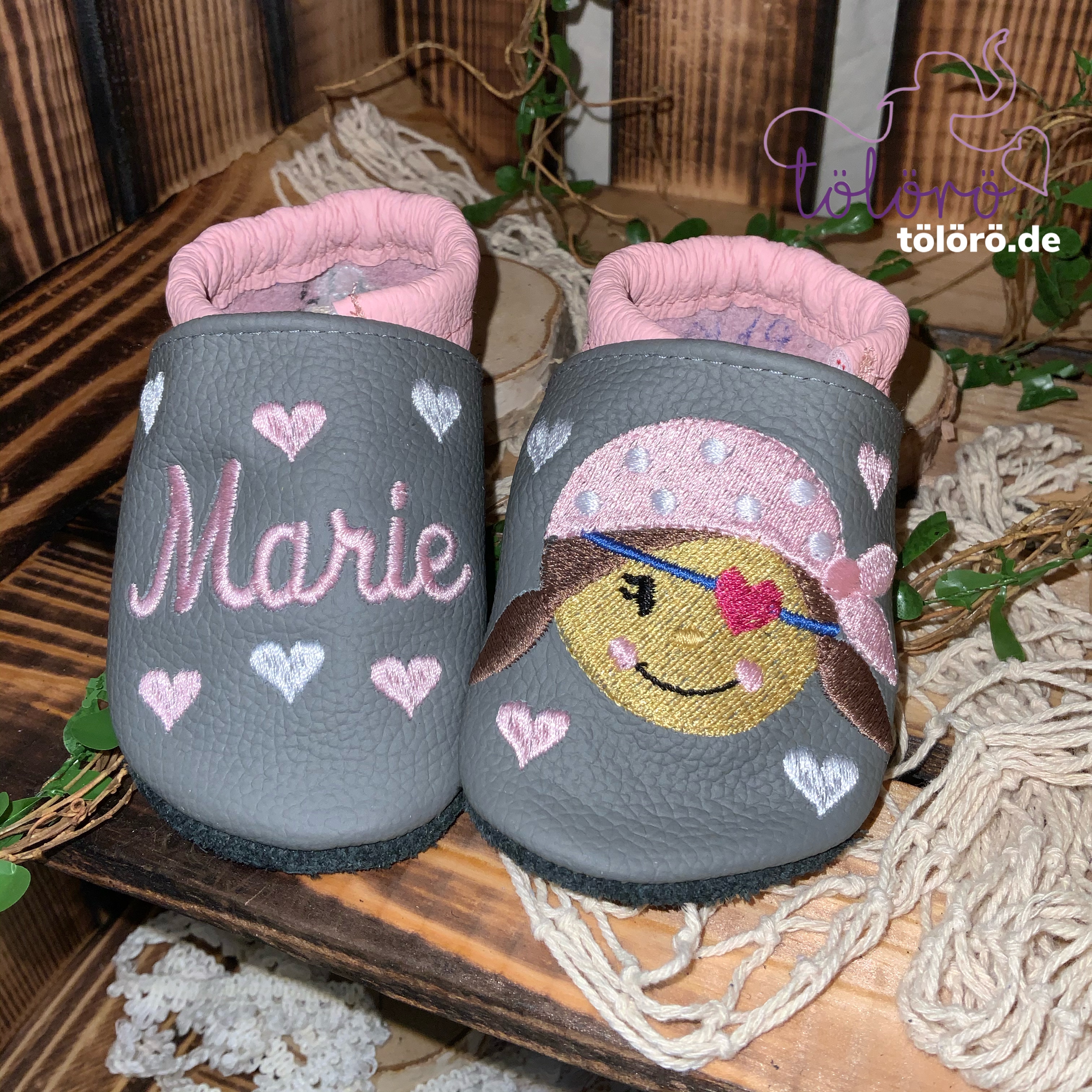 Beispiel Marie Kappe Anthrazit, Ferse Rosa - Herzen rosa und weiß