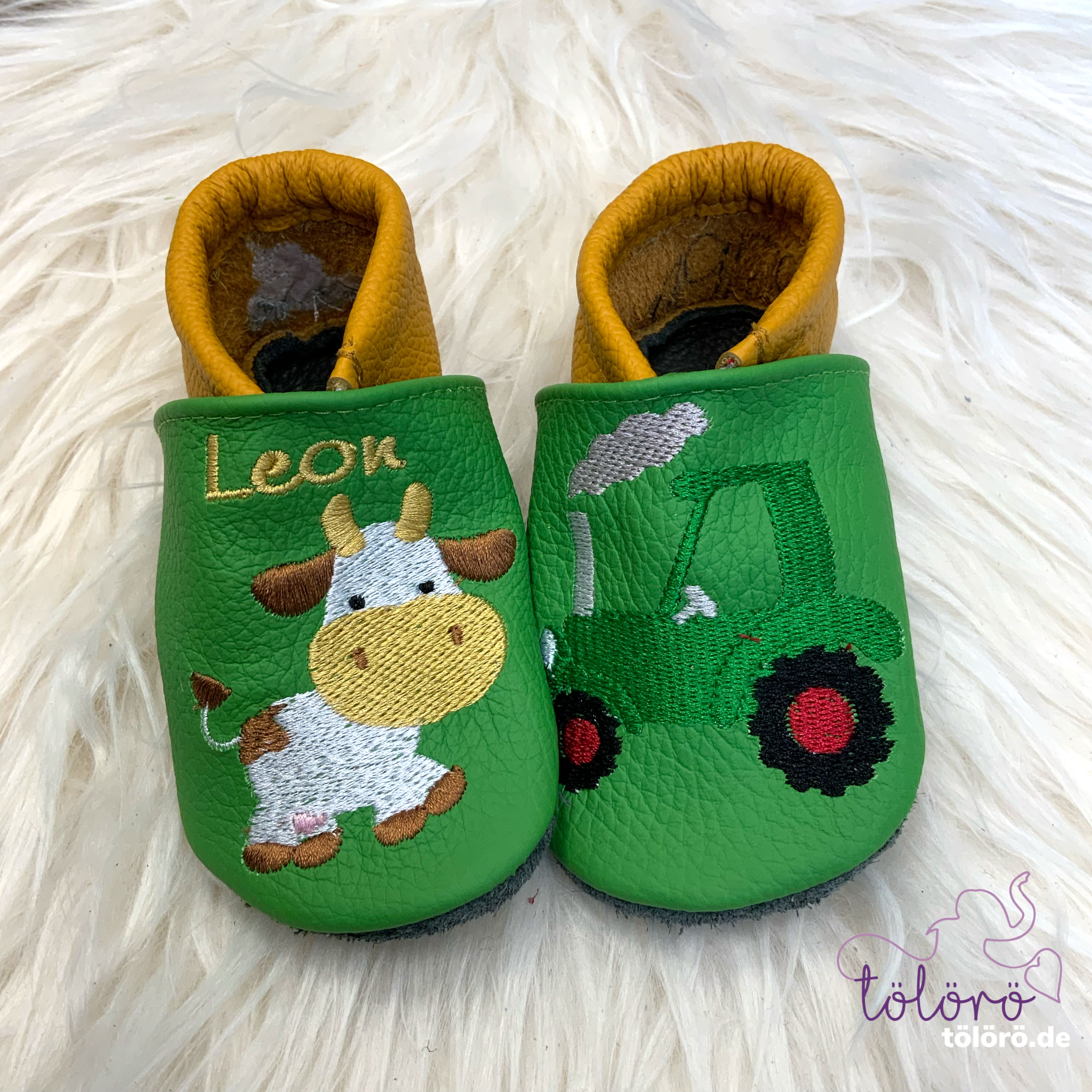 Beispiel Johannes Kappe hellblau, Ferse anthrazit - Traktor grün