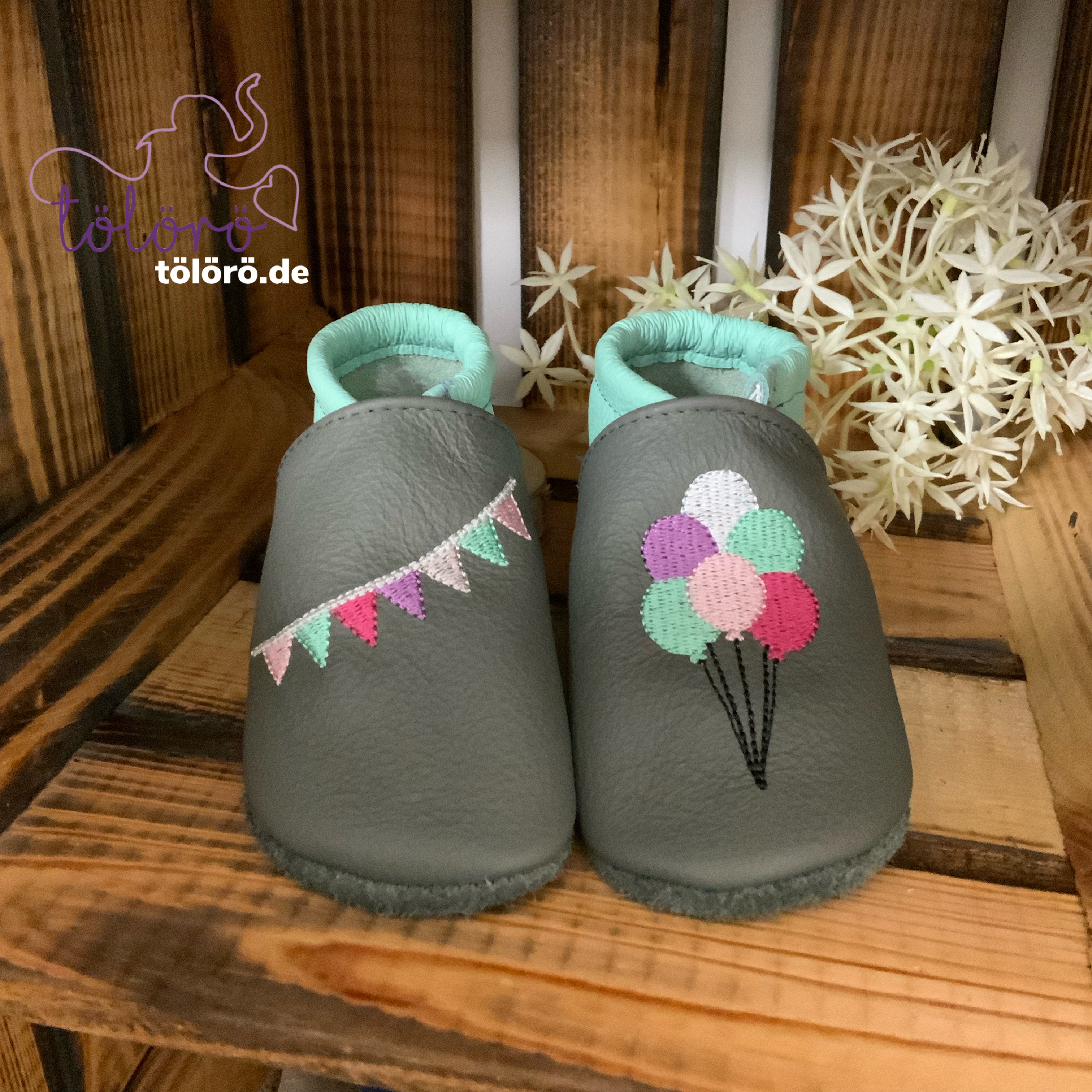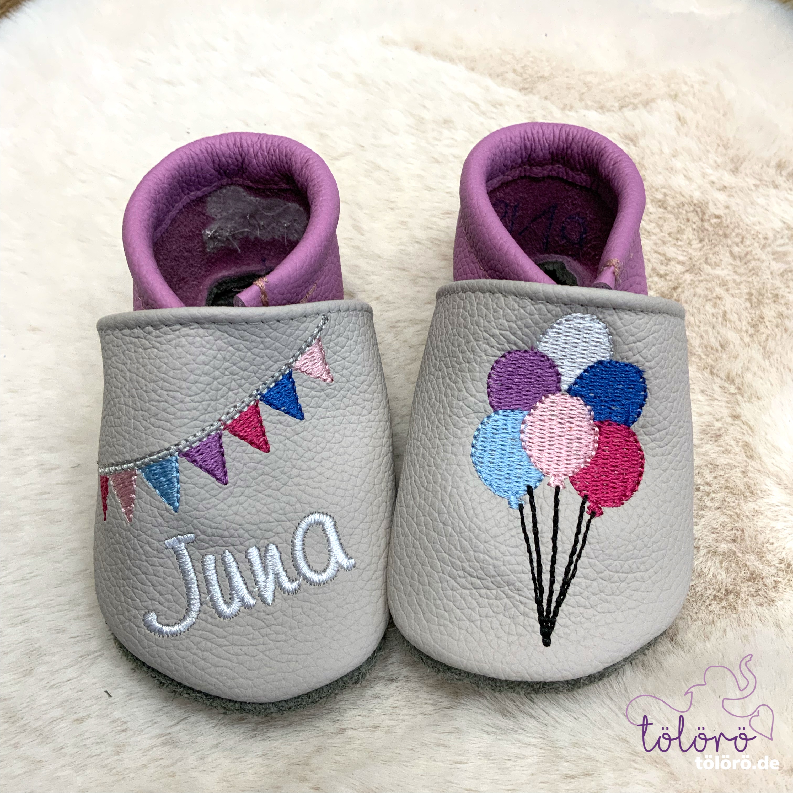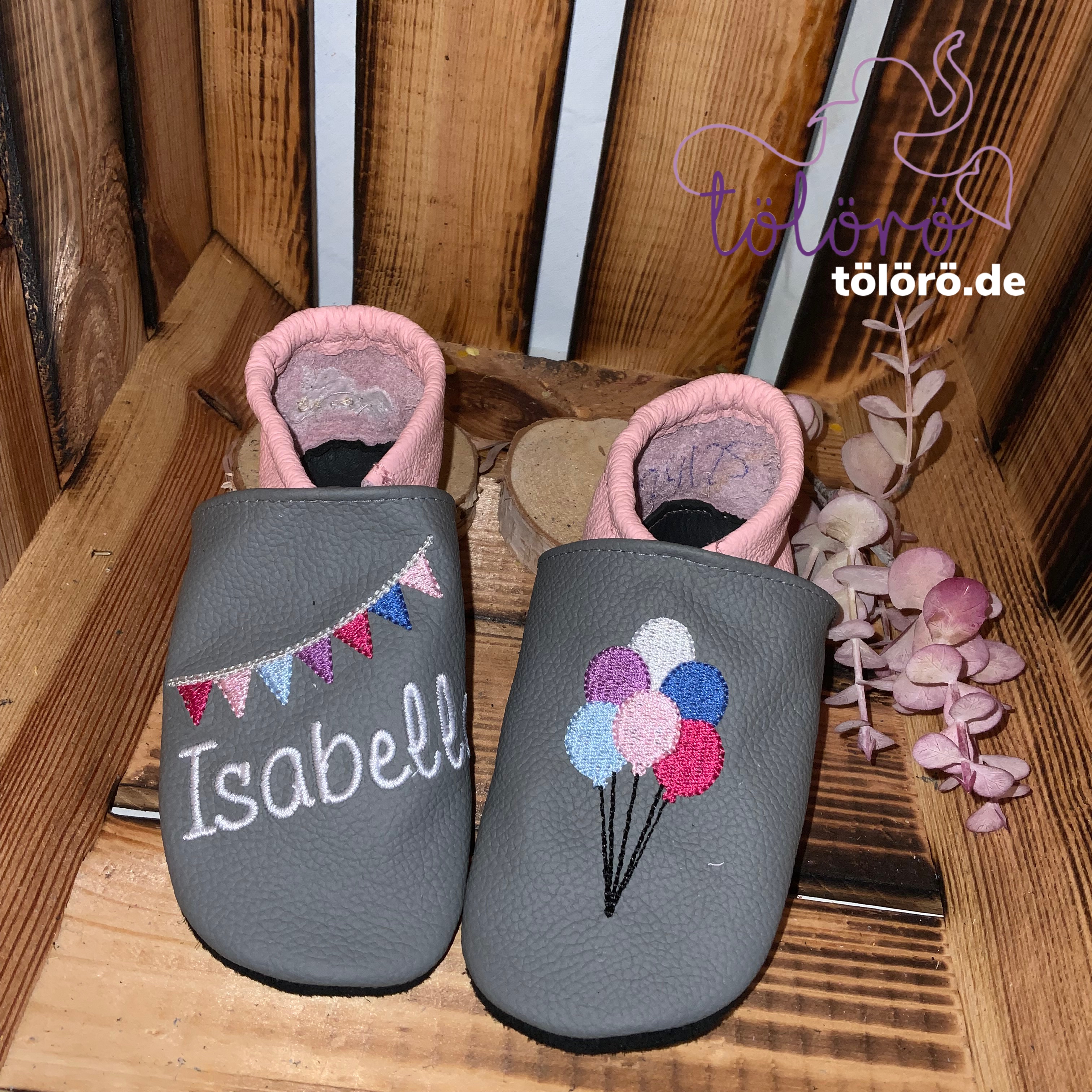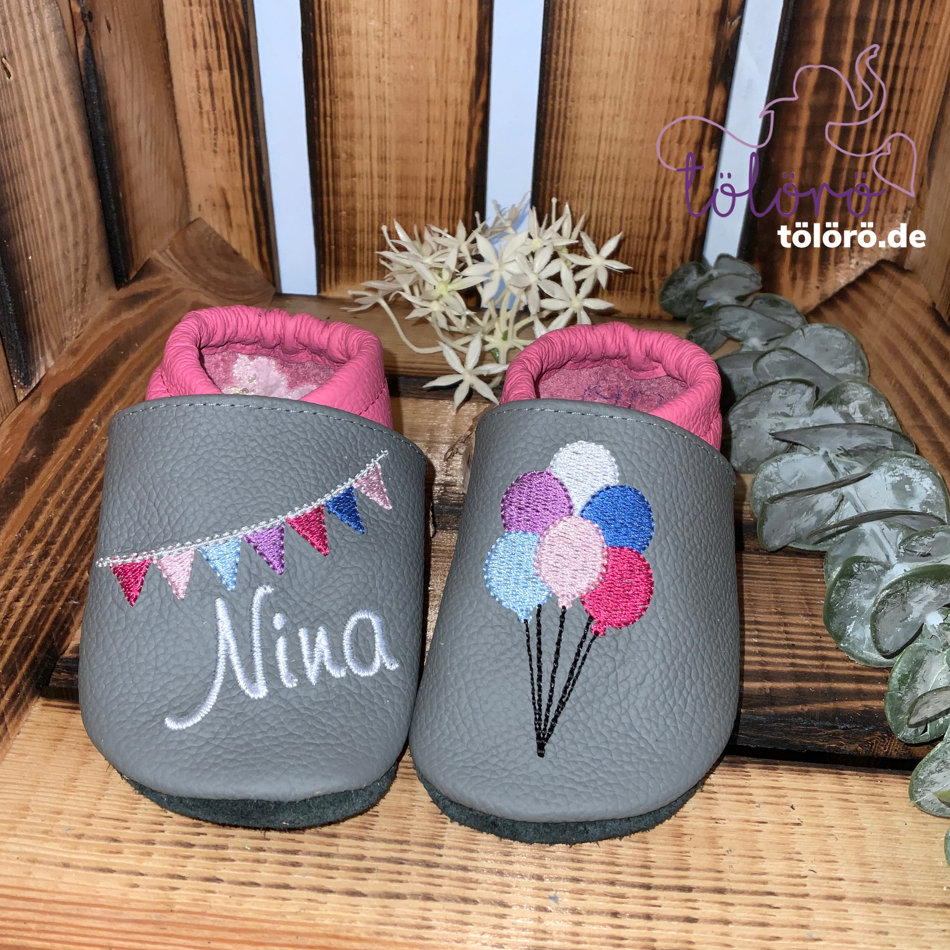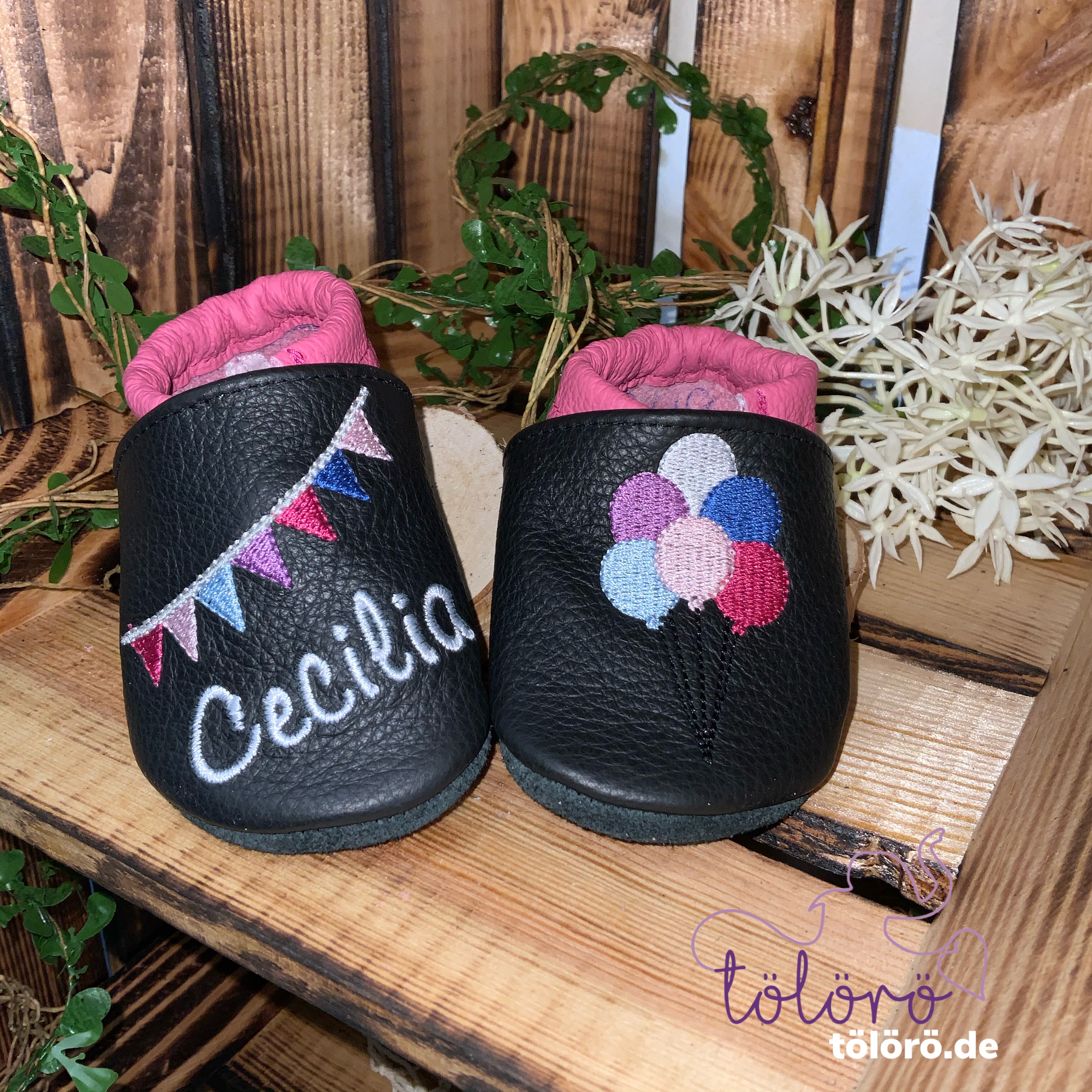 Name mit Wimpelkette und Luftballons