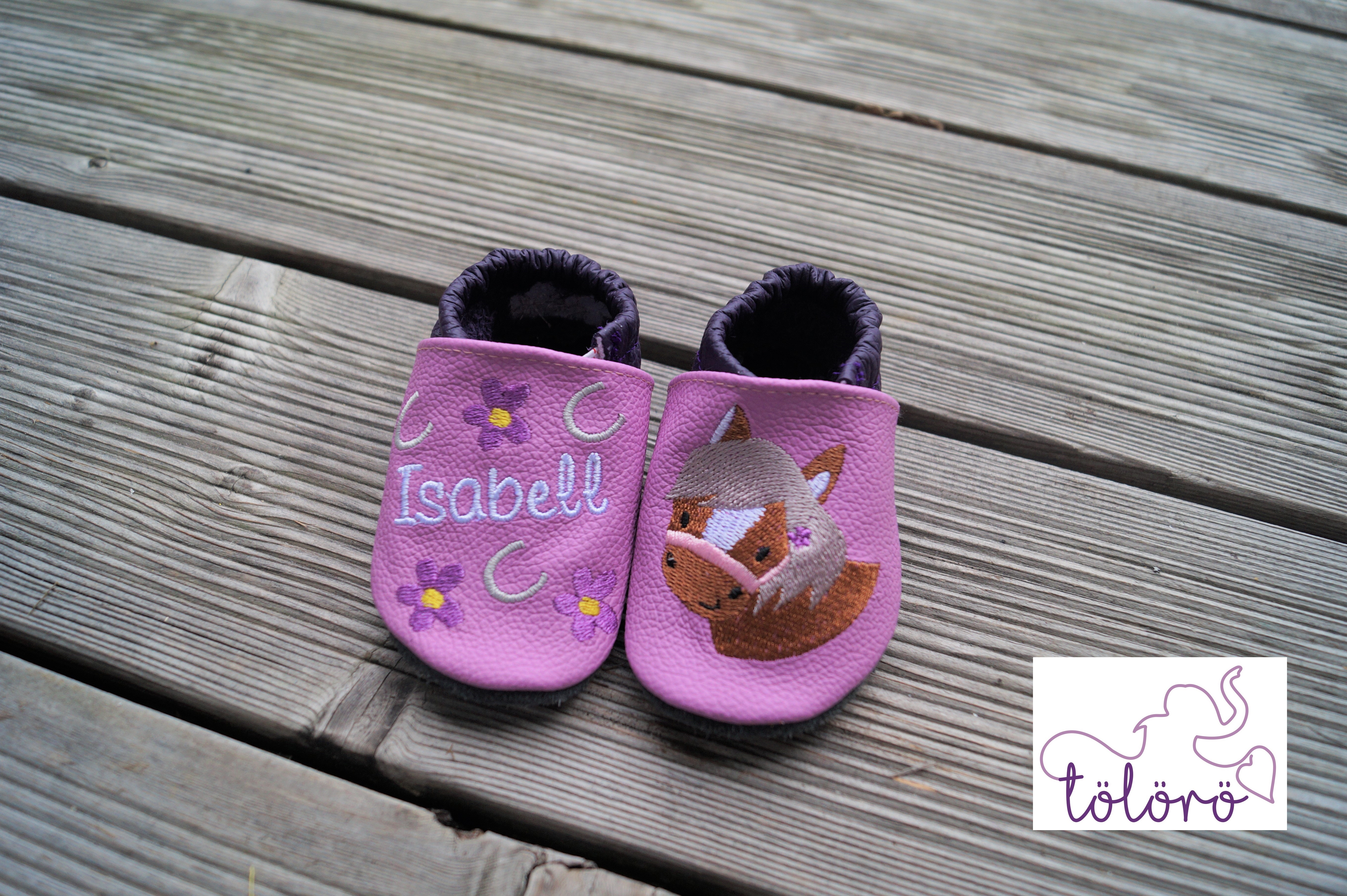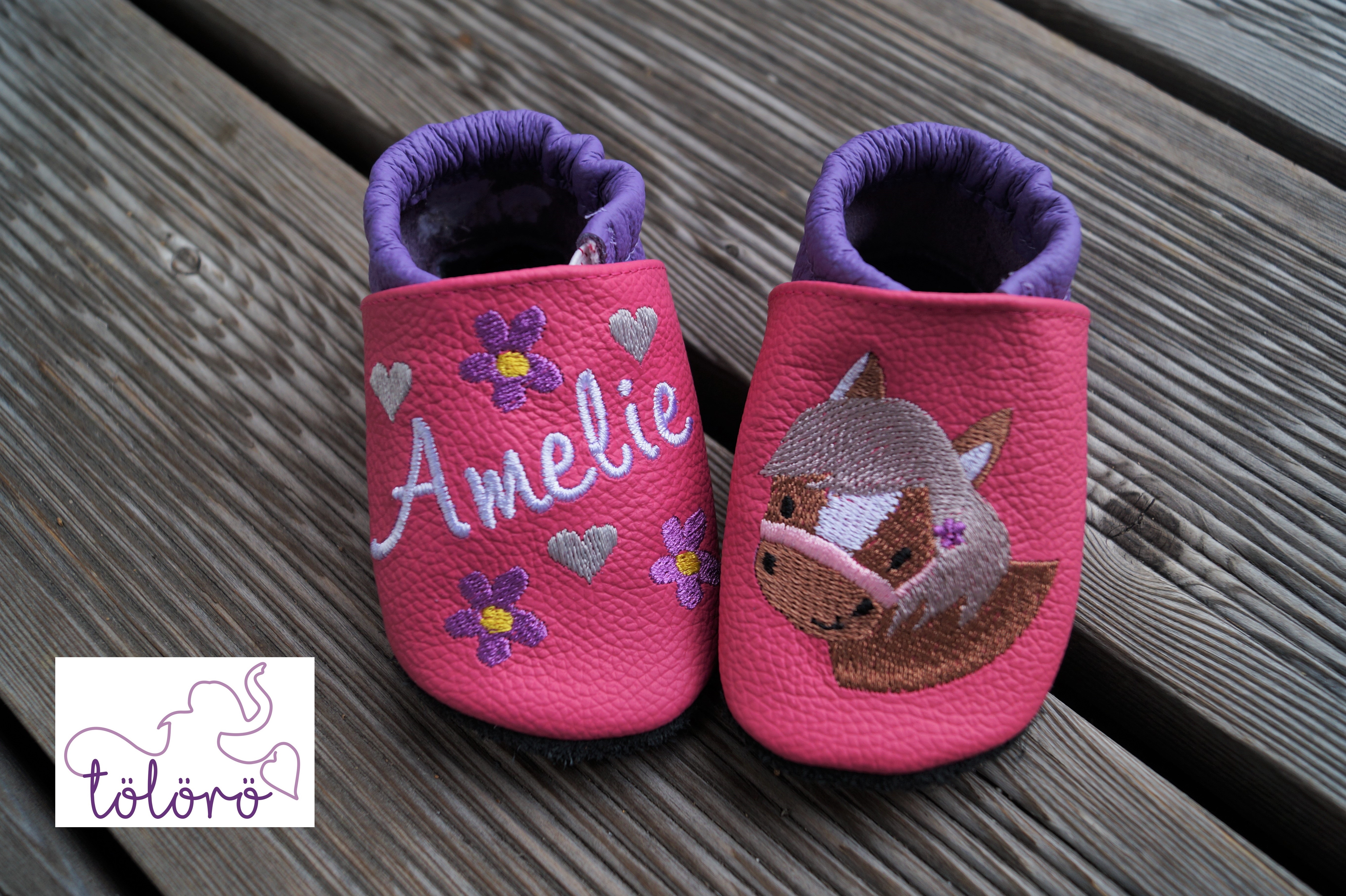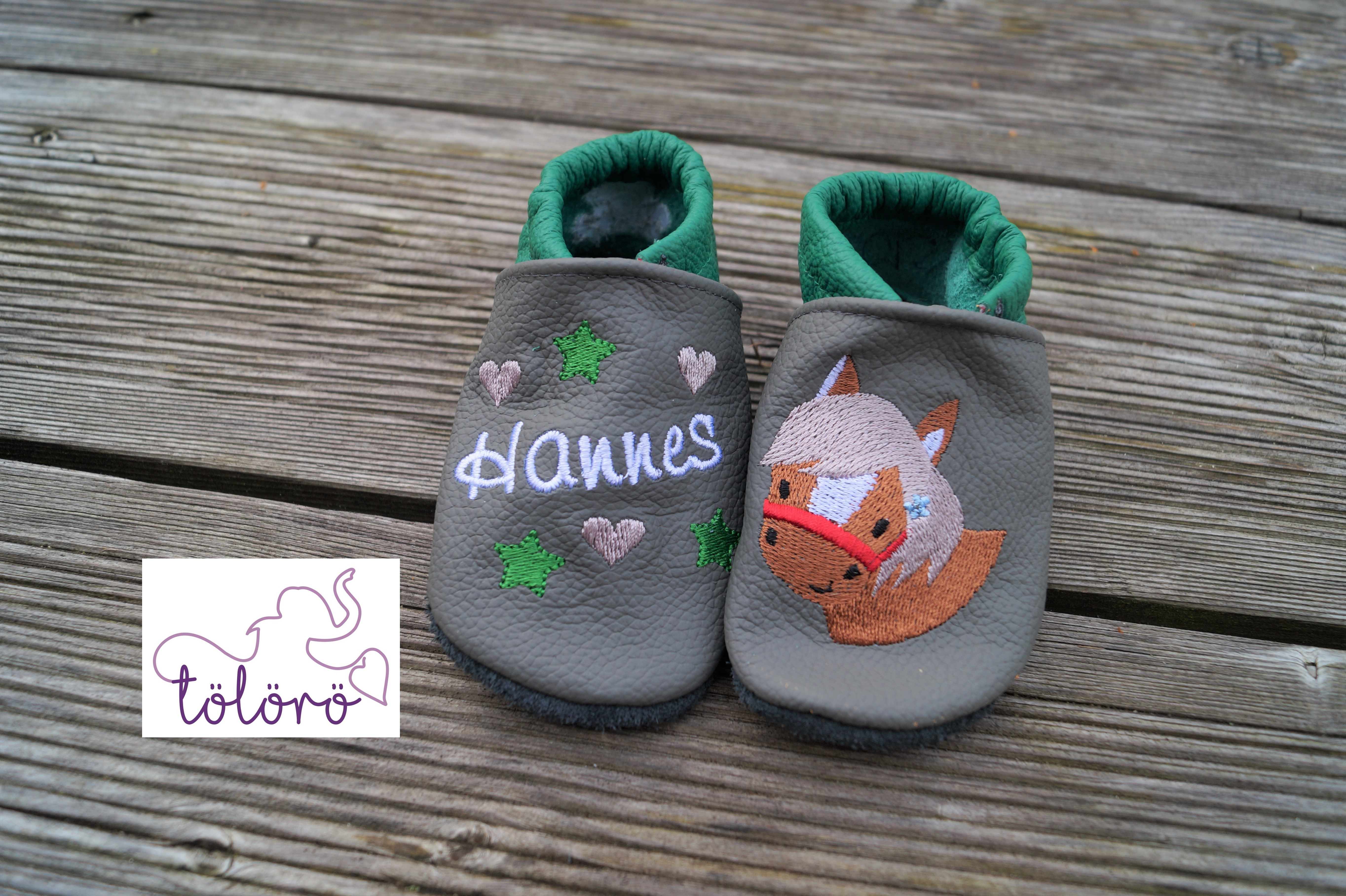 Name verziert mit Blumen und Herzen. Auf dem anderen Schuh Fritz das Pferd