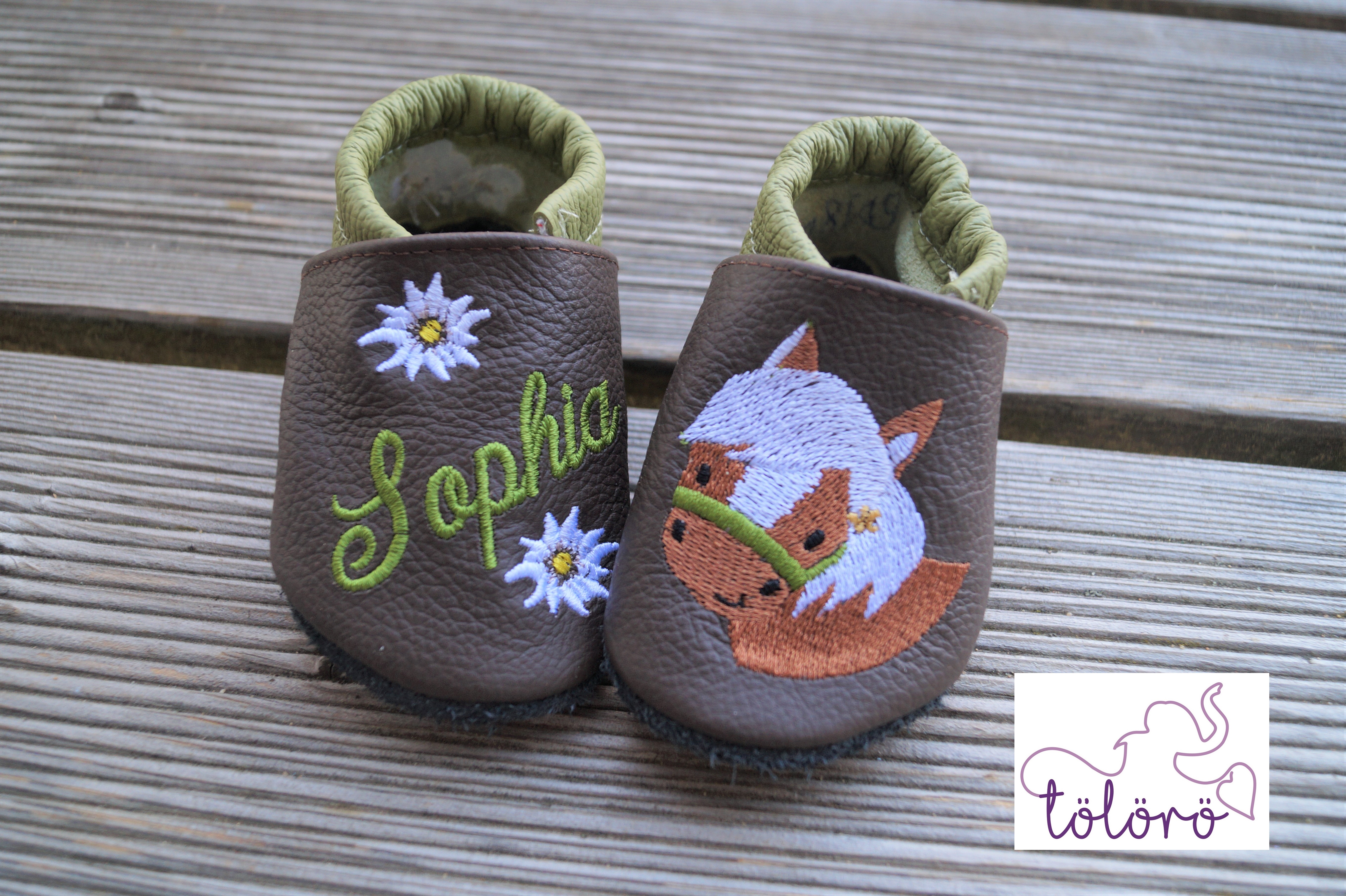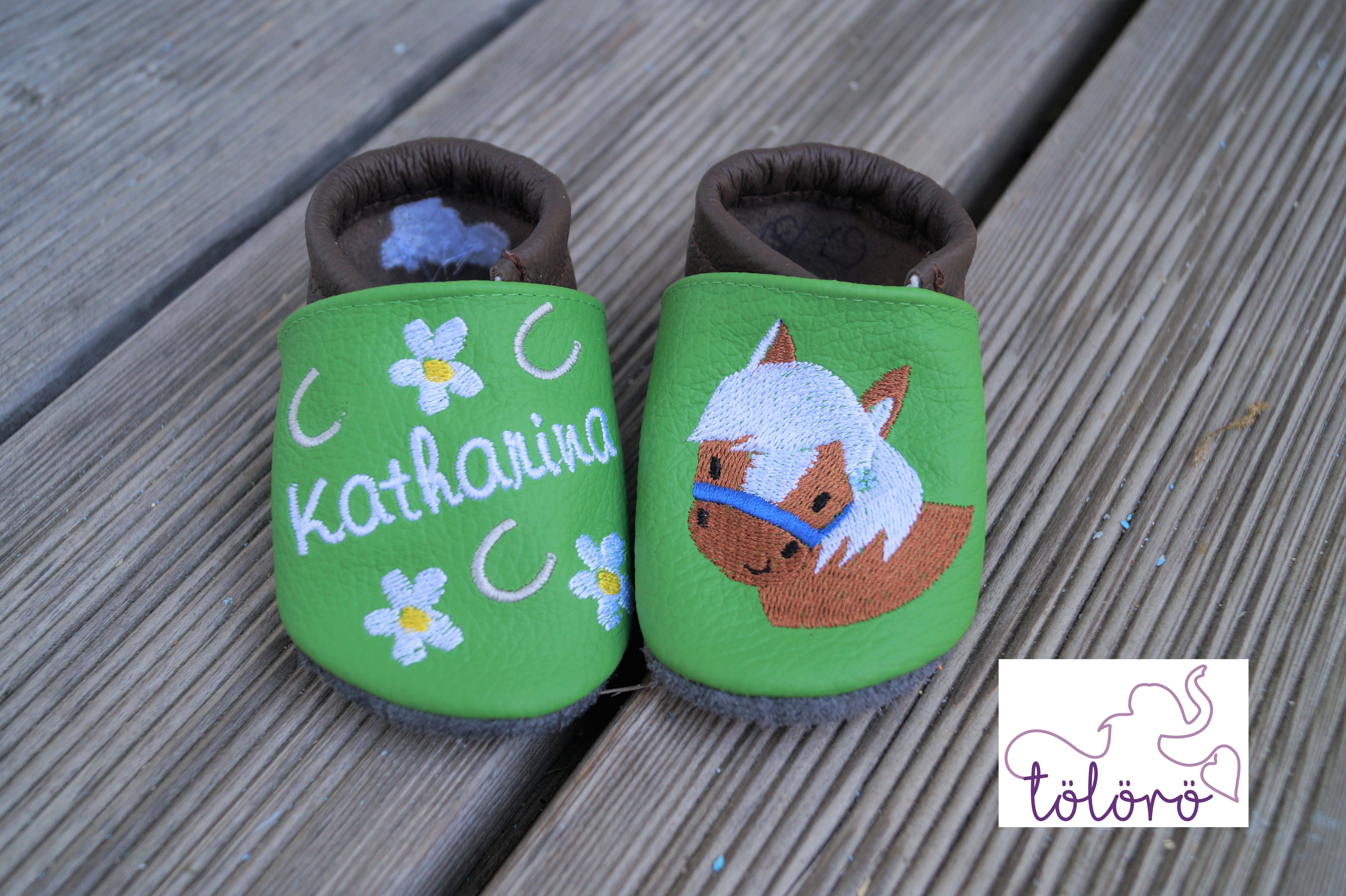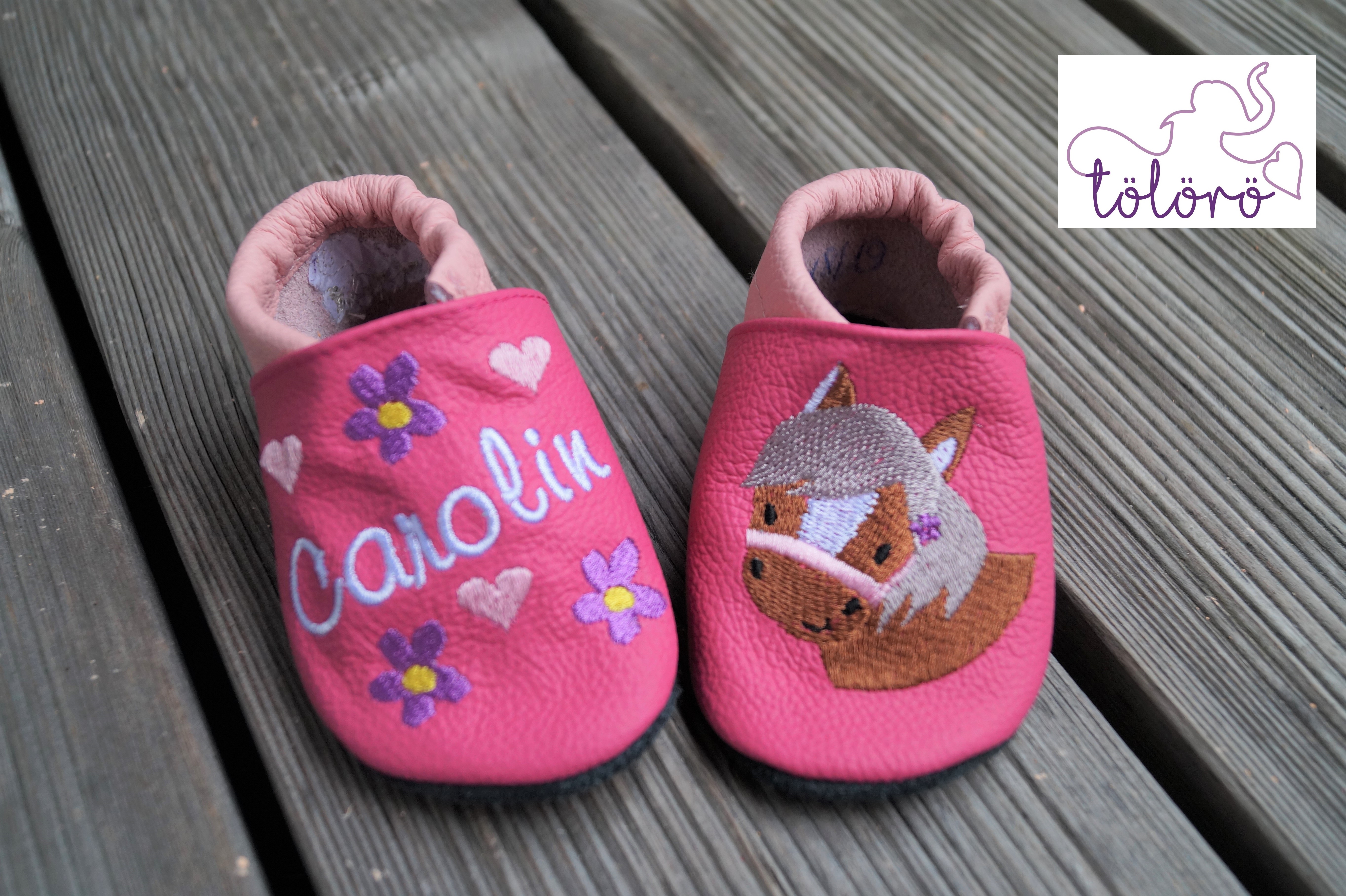Name verziert mit Blumen und Herzen. Auf dem anderen Schuh Fritz das Pferd