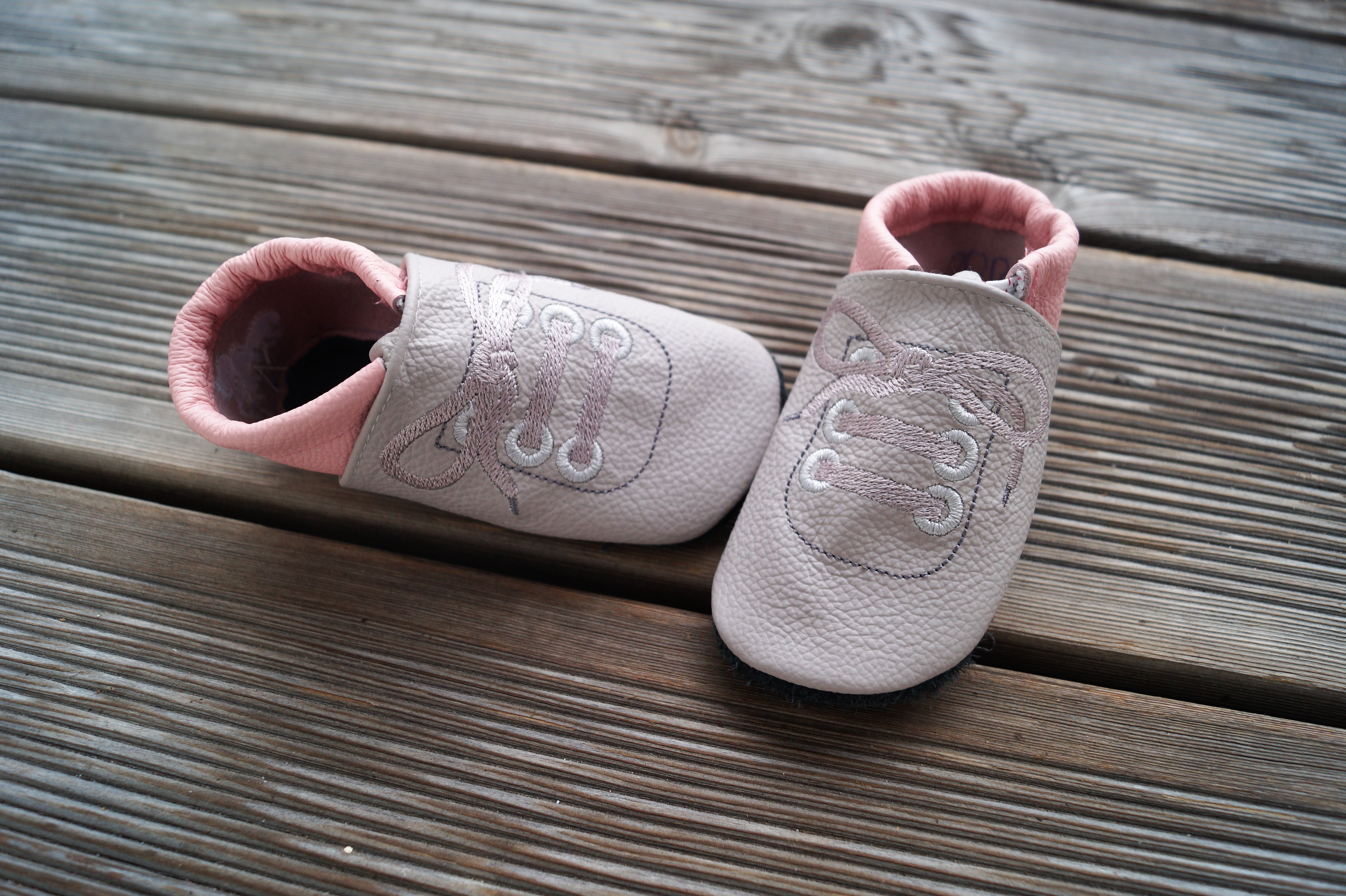 Beispiel Kappe Hellgrau, Ferse Rosa, Schnürsenkel Grau